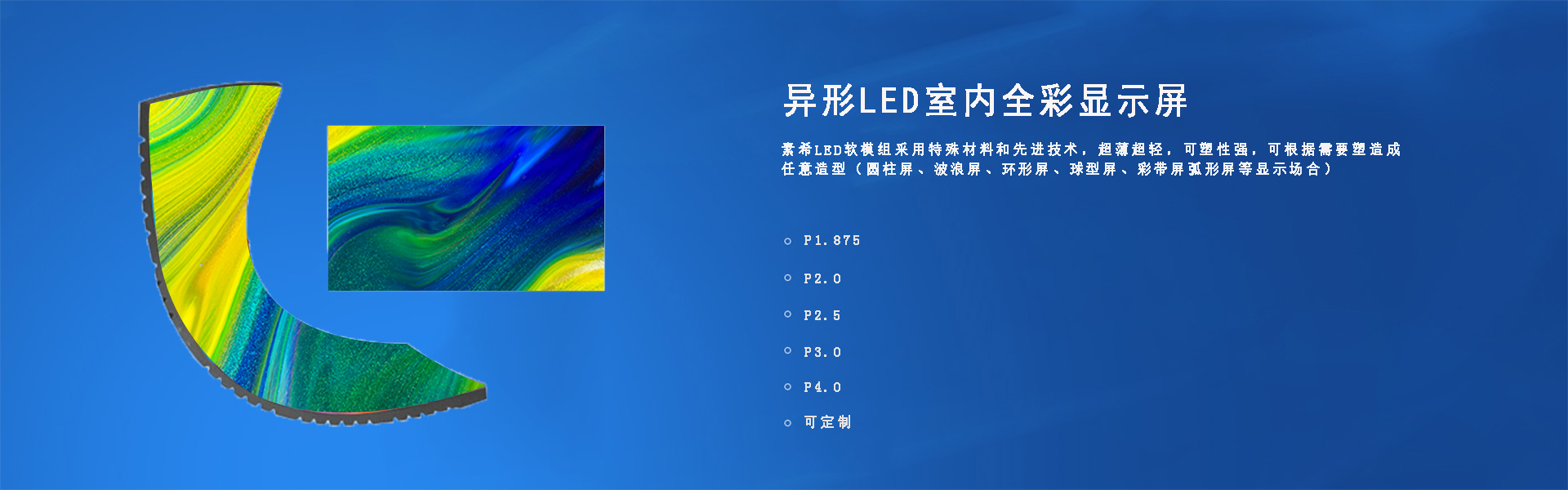 LED無縫拼接軟屏也稱作柔性LED顯示屏,軟模組、柔韌好、任意可彎曲,安裝可以是任意曲面,適合藝術(shù)造型;采用特殊材料和先進技術(shù),超薄超輕,單個模組的厚度僅8mm,不僅輕薄,可塑性強,該系列LED軟模組屬于異形LED大屏,采用可彎曲pcb和硅膠底殼套件,柔韌性強,可彎曲弧度最高120°(適用于圓柱屏、波浪屏、環(huán)形屏、球型屏、彩帶屏弧形屏等顯示場合)